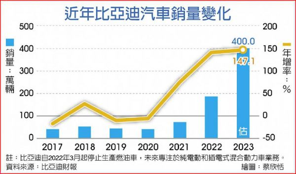 大陸新能源汽車巨頭比亞迪在經歷2019~2020年調整期後,全力鎖定新能源汽車衝刺,同時加大海外布局。在2022年成為大陸和全球新能源汽車市場的雙料冠軍後,傳出比亞迪2023年的銷量目標要達到400萬輛,這意味著其銷量年增率要延續2022年的水準,同樣達到1倍以上的成長。